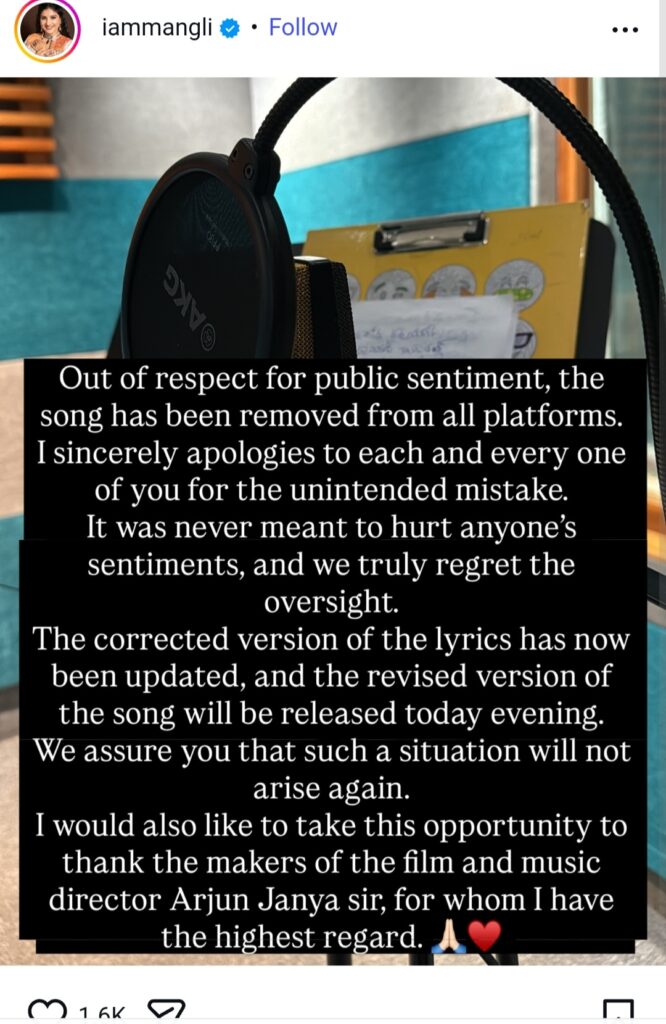 सिंगर मंगली ने अपने इंस्टाग्राम पर पोस्ट शेयर करते हुए लोगों से माफी मांगते हुए कहा कि उनका मकसद किसी की भावनाओं को ठेस पहुंचाना नहीं था.उन्होंने जल्द ही गाने के संशोधित वर्जन के रिलीज होने की बात कही है.मंगली ने कहा, “हमारा मकसद किसी को ठेस पहुंचाना नहीं था, लेकिन अगर किसी को ठेस पहुंची है तो हम माफी मांगते है. हमने गाने को फिर से रिकॉर्ड किया है और जल्द ही इसका संशोधित वर्जन रिलीज करेंगे.”