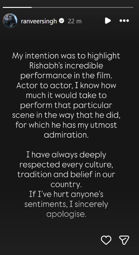 अभिनेता रणवीर सिंह ने हाल ही में अपनी इंस्टा स्टोरी में लिखा, “मैं सिर्फ ऋषभ शेट्टी के शानदार अभिनय को हाईलाइट करना चाहता था. मुझे पता है कि वह सीन तैयार करने में उन्होंने कितनी मेहनत की होगी, इसलिए मैं उनकी सराहना करता हूं.मैं हमेशा भारत की विविध संस्कृति, परम्पराओं और मान्यताओं का सम्मान करता आया हूँ. अगर मेरे इस कदम से किसी को ठेस पहुँची हो, तो मैं दिल से क्षमा