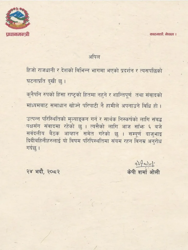 इस्तीफे के बाद भी ओली ने जनता से संयम बरतने की अपील की। उन्होंने देश के नाम संबोधन में कहा, “मैं कल राजधानी और देश के विभिन्न हिस्सों में हुए विरोध प्रदर्शनों और उसके बाद की घटनाओं से दुखी हूं. हमारी नीति है कि किसी भी तरह की हिंसा देश के हित में नहीं है और हम शांतिपूर्ण और बातचीत के ज़रिए समाधान चाहते हैं. स्थिति का आकलन करने और सार्थक समाधान खोजने के लिए मैं संबंधित पक्षों से बातचीत कर रहा हूं. इसके लिए मैंने आज शाम 6 बजे सभी राजनीतिक दलों की बैठक भी बुलाई है. मैं सभी भाई-बहनों से विनम्र निवेदन करता हूं कि इस मुश्किल समय में शांत रहें.”